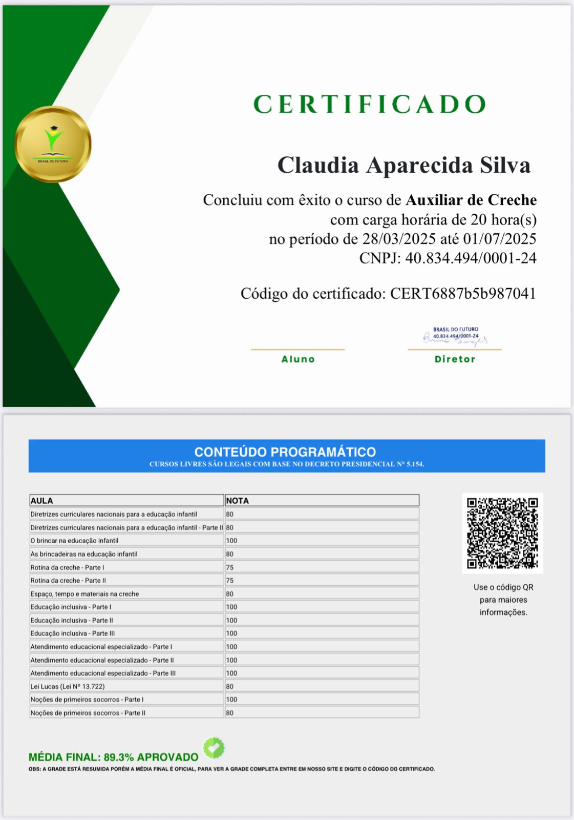 Ao concluir o curso, você recebe um certificado válido em todo o Brasil, ideal para comprovar seus conhecimentos e abrir portas no mercado de trabalho.